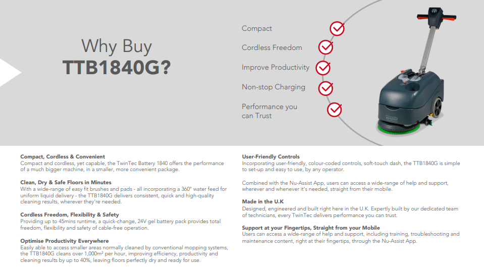The TTB1840G is a compact battery powered scrubber dryer that is perfect for use in busy public areas such as schools, shopping centres and events, confined spaces and environments where cables can become snagged on equipment or furniture.