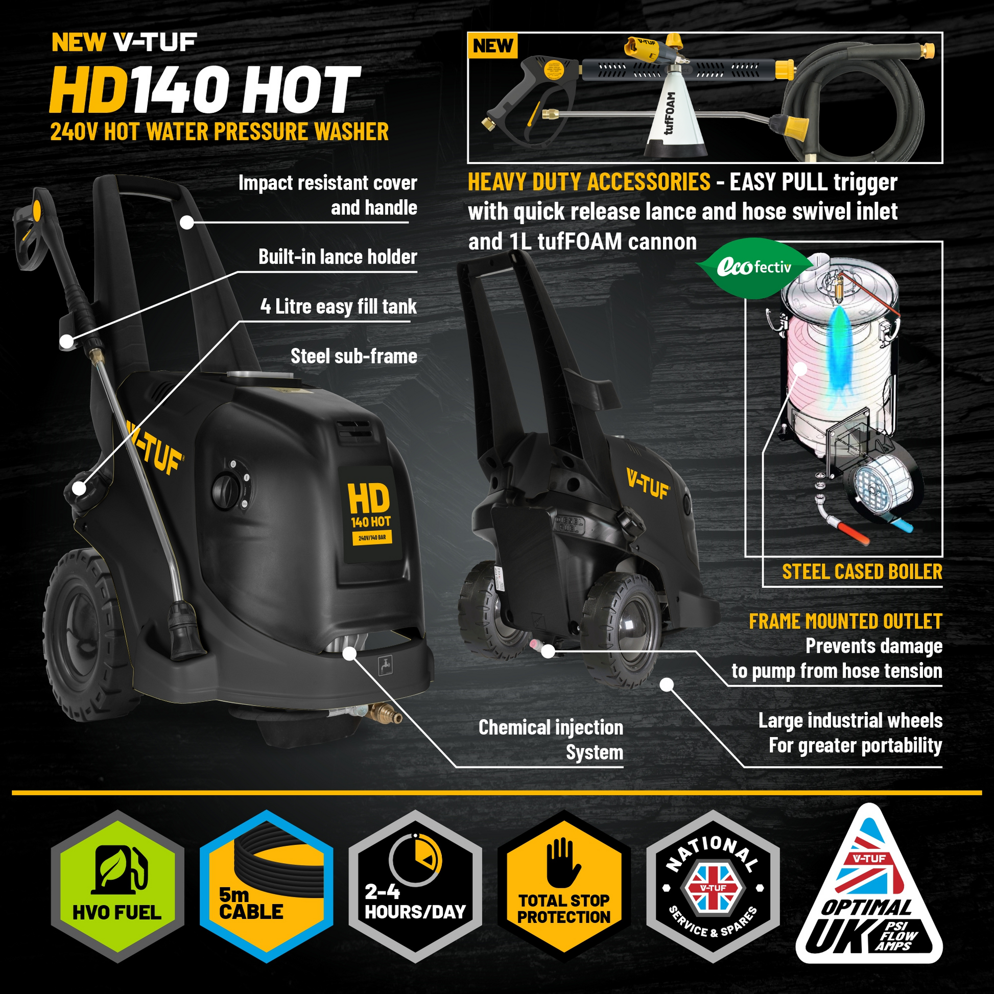 Equipped with a low-amp 2800 RPM industrial motor, it ensures reliable start-up every time, and a 4L diesel boiler tank provides continuous hot-water performance for extended cleaning tasks.