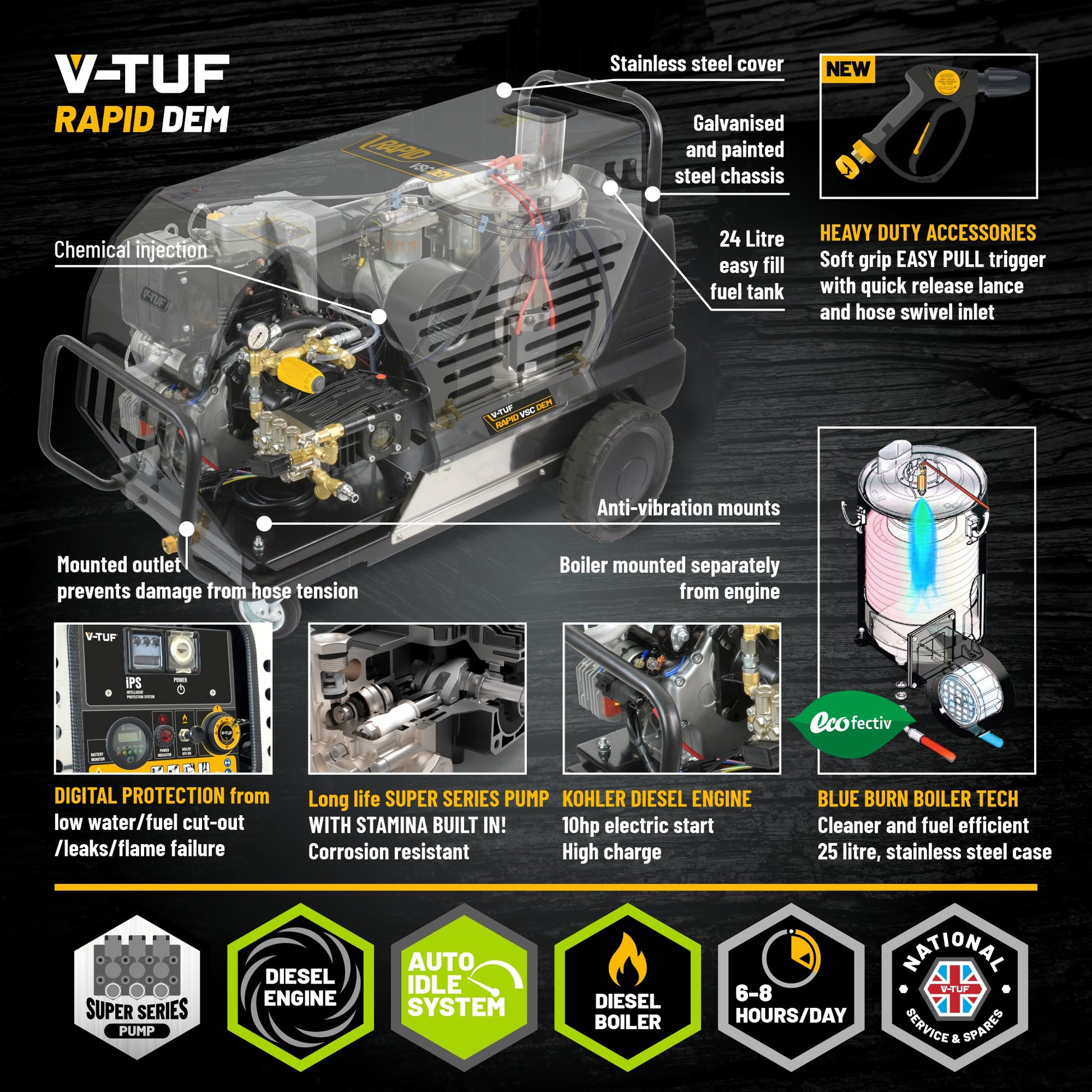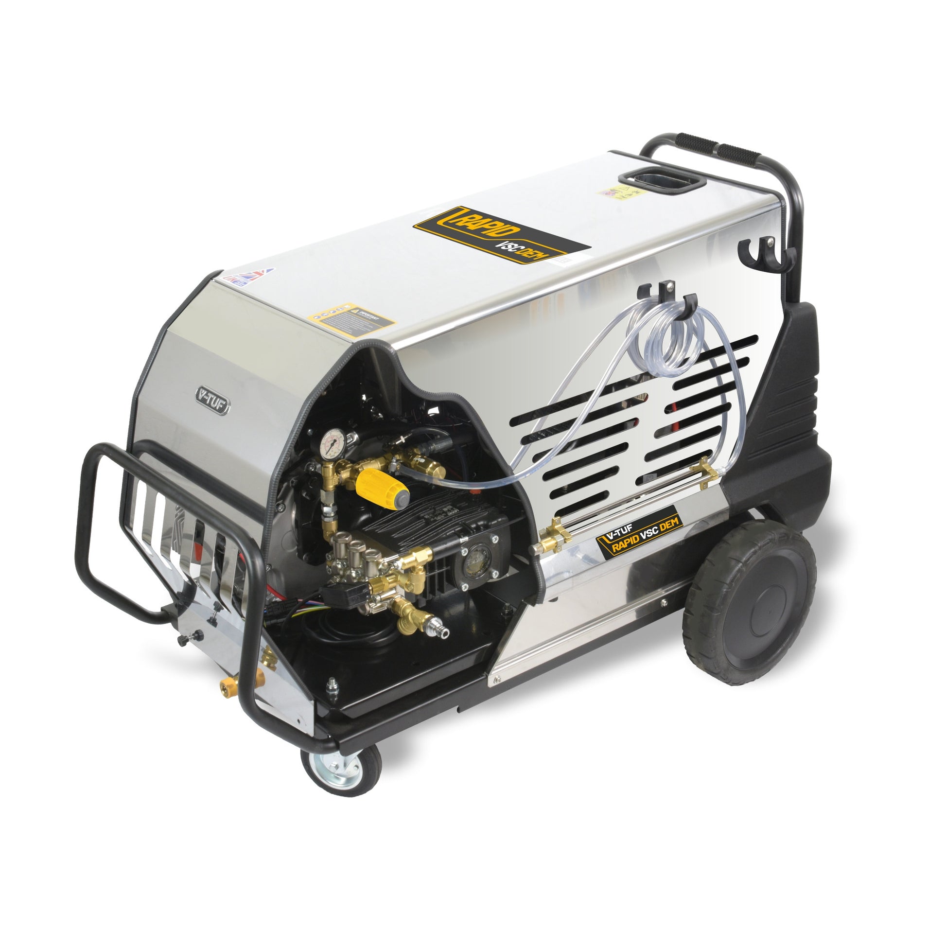 The V-TUF RAPID-VSC-DEM hot water pressure washer provides optimal performance, durability, and efficiency. In addition to providing remarkable cleaning results and allowing you to use less chemical, hot water cleaning optimises the cleaning process and saves 35% of cleaning time.